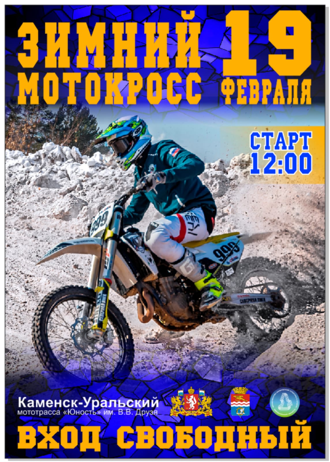 Приглашаем на соревнования по зимнему мотокроссу!!!16 февраля '2219 февраля 2022 года в Каменске-Уральском на стадионе технических видов спорта «Юность» им. В.В. Друзя (ул. Кадочникова) состоятся: Чемпионат и Первенство Свердловской области 2022 года по зимнему мотокроссу. В соревнованиях примут участие именитые российские спортсмены и юные мотогонщики. Ожидаются спортсмены из Екатеринбурга, Челябинска, Тюмени, Кургана и многих городов Свердловской, Курганской, Челябинской области. Среди участников соревнований - призёры Первенств и Чемпионатов областей, Федеральных округов, Чемпионатов России. Для любителей мотокросса организована удобная парковка и подъезд к месту соревнований. Удобное расположение трибун на стадионе позволяет следить за развитием всей гонки из любого места. Во время соревнований будут работать пункты питания для зрителей. Рёв моторов, адреналин и насыщенный накал борьбы спортсменов с соответствующим музыкальным сопровождением, неповторимая атмосфера праздника, энергетика экстрима оставят у каждого незабываемые впечатления и обязательно порадуют любителей мотоциклетного спорта! Начало соревнований: в 12.00 час, вход свободный. Директор соревнований – Заслуженный Мастер спорта России Хомицевич Виталий Валерьевич. Технический организатор: МАУ «КУСШТВС «Юность-ДОСААФ», 8 (3439) 32-50-55
