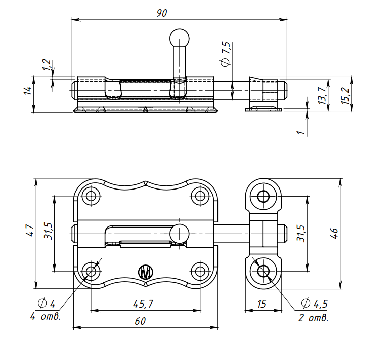 Задвижка накладная (шпингалет) ЗТ2-60, цинк