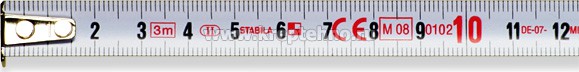 Армированная начальная часть ленты (у рулеток начиная с длин от 5 м). Буфер гасящий удар крючка о корпус при втягивании ленты. Деление в см и мм. Десятичные цифры красного цвета.