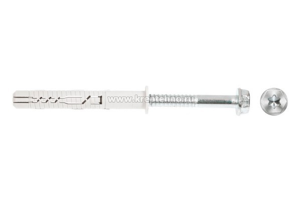 Комплект состоит из высококачественного нейлонового дюбеля, снабженного прижимным кольцом и специального закаленного шурупа с переменной толщиной распорного стержня.