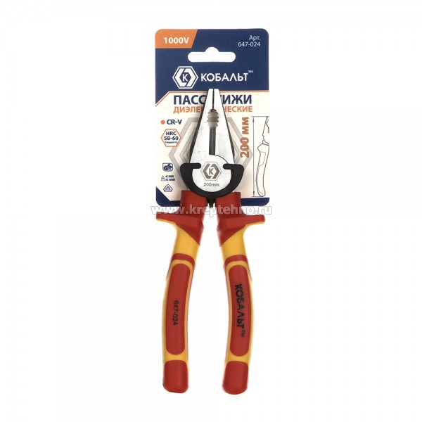 Пассатижи диэлектрические 200 мм КОБАЛЬТ 647-024, предназначены для надежного удержания и фиксирования различных плоских и круглых деталей при проведении ремонтных работ, вывинчивания сломанных винтов, для резки вязальной проволоки и проволоки из цветных металлов, электрических проводов небольшого сечения, обжимки электрических наконечников, в качестве вспомогательного инструмента при затягивании/отпускании резьбового крепежа находящимися под напряжением до 1000 Вольт.