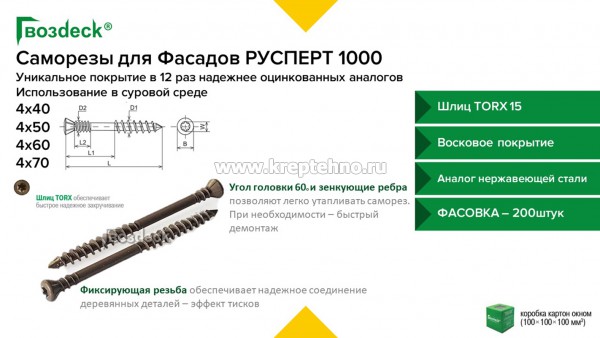 Саморезы для фасада с защитным покрытием Русперт 1000 производятся из углеродистой стали с небольшой головкой, что допускает временный контакт с пресной водой и древесиной не содержащей вещества, вызывающие ускоренную коррозию.