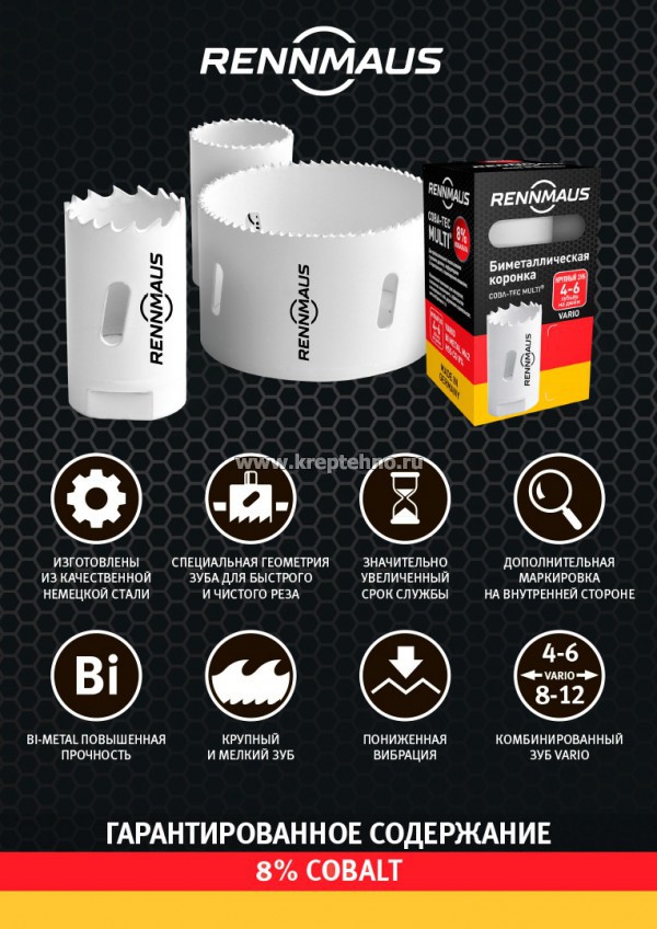 Купить Коронку HSS-Bi-Metall крупный зуб RENNMAUS в Екатеринбурге и Свердловской области можно в сети магазинов КРЕПЕЖ-СИТИ.