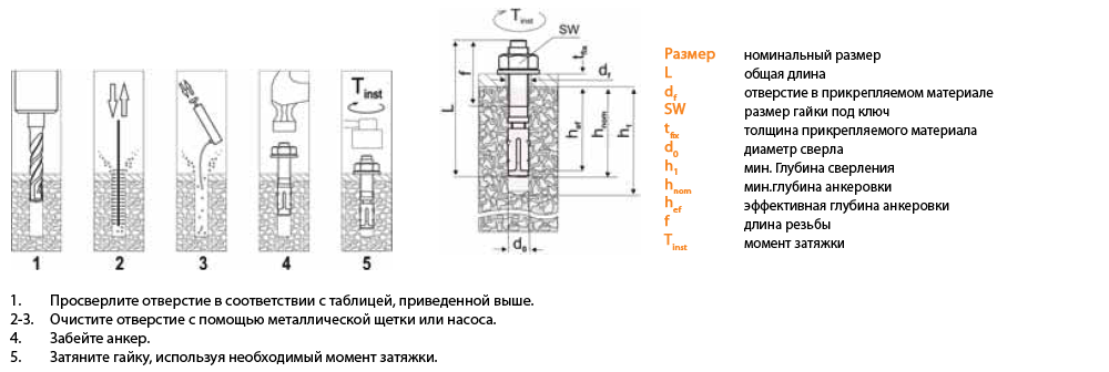 КЛИНОВОЙ АНКЕР, S-KA электрооцинкованная сталь Данный клиновой анкер c регулируемым моментом затяжки предназначен для использования в напряженном и ненапряженном (без трещин) бетоне. Также его можно устанавливать в плотных основаниях, таких как полнотелый кирпич (макс. ø M8) и натуральный камень. Анкер заранее собран и готов к прямому сквозному монтажу. Может использоваться в сухих помещениях. ПАРАМЕТРЫ УСТАНОВКИ | Размер | параметры установки | | | Данные по анкеру и материалу | параметры установки | | | размер | L | df | f | SW | tfix | d0 | h1 | hnom | hef | | | mm | mm | mm | mm | mm | mm | mm | mm | mm | mm | | 6 / 15 4) | M6 | 65 | 7 | 38 | 10 | 15 | 6 | 50 | 40 | 35 | | | 6 / 50 4) | M6 | 100 | 7 | 60 | 10 | 50 | 6 | 50 | 40 | 35 | | | 8 / 10 | M8 | 72 | 9 | 32 | 13 | 10 | 8 | 60 | 50 | 45 | | | 8 / 30 | M8 | 92 | 9 | 52 | 13 | 30 | 8 | 60 | 50 | 45 | | | 8 / 50 | M8 | 112 | 9 | 72 | 13 | 50 | 8 | 60 | 50 | 45 | | | 8 / 85 | M8 | 147 | 9 | 107 | 13 | 85 | 8 | 60 | 50 | 45 | | | 10 / 10 | M10 | 92 | 12 | 47 | 17 | 10 | 10 | 75 | 68 | 60 | | | 10 / 20 | M10 | 102 | 12 | 57 | 17 | 20 | 10 | 75 | 68 | 60 | | | 10 / 30 | M10 | 112 | 12 | 67 | 17 | 30 | 10 | 75 | 68 | 60 | | | 10 / 50 | M10 | 132 | 12 | 87 | 17 | 50 | 10 | 75 | 68 | 60 | | | 10 / 80 | M10 | 162 | 12 | 115 | 17 | 80 | 10 | 75 | 68 | 60 | | | 12 / 5 | M12 | 103 | 14 | 53 | 19 | 5 | 12 | 90 | 81 | 70 | | | 12 / 20 | M12 | 118 | 14 | 68 | 19 | 20 | 12 | 90 | 81 | 70 | | | 12 / 30 | M12 | 128 | 14 | 78 | 19 | 30 | 12 | 90 | 81 | 70 | | | 12 / 50 | M12 | 148 | 14 | 98 | 19 | 50 | 12 | 90 | 81 | 70 | | | 12 / 65 | M12 | 163 | 14 | 113 | 19 | 65 | 12 | 90 | 81 | 70 | | | 12 / 80 | M12 | 178 | 14 | 115 | 19 | 80 | 12 | 90 | 81 | 70 | | | 12 / 155 4) | M12 | 253 | 14 | 46 | 19 | 155 | 12 | 90 | 81 | 70 | | | 16 / 5 | M16 | 123 | 18 | 65 | 24 | 5 | 16 | 110 | 96 | 85 | | | 16 / 20 | M16 | 138 | 18 | 80 | 24 | 20 | 16 | 110 | 96 | 85 | | | 16 / 50 | M16 | 168 | 18 | 110 | 24 | 50 | 16 | 110 | 96 | 85 | | | 16 / 60 | M16 | 178 | 18 | 115 | 24 | 60 | 16 | 110 | 96 | 85 | | | 16 / 95 4) | M16 | 213 | 18 | 55 | 24 | 95 | 16 | 110 | 96 | 85 | | | 20 / 20 4) | M20 | 170 | 22 | 55 | 30 | 20 | 20 | 135 | 125 | 110 | | | 20 / 70 4) | M20 | 220 | 22 | 55 | 30 | 70 | 20 | 135 | 125 | 110 | | | 20 / 130 4) | M20 | 280 | 22 | 55 | 30 | 130 | 20 | 135 | 125 | 110 | | | --------------- | | | | | | | | | | | | | 6 x 40 4) | M6 | 40 | 7 | 18 | 10 | 2 | 6 | 35 | 30 | 25 | | | 8 x 50 4) | M8 | 52 | 9 | 23 | 13 | 2 | 8 | 45 | 40 | 30 | | | 10 x 60 4) | M10 | 62 | 12 | 26 | 17 | 3 | 10 | 50 | 40 | 30 | | | 12 x 85 4) | M12 | 85 | 14 | 45 | 19 | 3 | 12 | 75 | 65 | 55 | | | 16 x 90 4) | M16 | 90 | 18 | 43 | 24 | 3 | 16 | 80 | 70 | 60 | | 4) Не входит в ETA.  ДОПУСТИМЫЕ НАГРУЗКИ | Размер | | допустимая нагрузка 1) 2) в кН В ненапряженном бетоне C20/25 Опция 1 – метод расчетов А | допустимая нагрузка 1) 2) в кН В напряженном бетоне C20/25 Опция 1 – метод расчетов А | | | растягивающее усилие | срезающее усилие 3) | растягивающее усилие | срезающее усилие 3) | | | Tinst | Nsk | Vsk | Nsk | Vsk | | | Нm | кН | кН | кН | кН | | | | | | | 6 / 15 4) | 7 | 1,8 | 1,8 | - | - | | | | | | | 6 / 50 4) | 7 | 1,8 | 1,8 | - | - | | | | | | | 8 / 10 | 20 | 3,6 | 4,8 | 2,0 | 4,8 | | | | | | | 8 / 30 | 20 | 3,6 | 4,8 | 2,0 | 4,8 | | | | | | | 8 / 50 | 20 | 3,6 | 4,8 | 2,0 | 4,8 | | | | | | | 8 / 85 | 20 | 3,6 | 4,8 | 2,0 | 4,8 | | | | | | | 10 / 10 | 35 | 6,3 | 8,6 | 3,6 | 8,6 | | | | | | | 10 / 20 | 35 | 6,3 | 8,6 | 3,6 | 8,6 | | | | | | | 10 / 30 | 35 | 6,3 | 8,6 | 3,6 | 8,6 | | | | | | | 10 / 50 | 35 | 6,3 | 8,6 | 3,6 | 8,6 | | | | | | | 10 / 80 | 35 | 6,3 | 8,6 | 3,6 | 8,6 | | | | | | | 12 / 5 | 50 | 7,9 | 11,0 | 4,8 | 11,0 | | | | | | | 12 / 20 | 50 | 7,9 | 11,0 | 4,8 | 11,0 | | | | | | | 12 / 30 | 50 | 7,9 | 11,0 | 4,8 | 11,0 | | | | | | | 12 / 50 | 50 | 7,9 | 11,0 | 4,8 | 11,0 | | | | | | | 12 / 65 | 50 | 7,9 | 11,0 | 4,8 | 11,0 | | | | | | | 12 / 80 | 50 | 7,9 | 11,0 | 4,8 | 11,0 | | | | | | | 12 / 1554) | 50 | 6,4 | 6,4 | - | - | | | | | | | 16 / 5 | 120 | 16,7 | 21,0 | 9,5 | 21,0 | | | | | | | 16 / 20 | 120 | 16,7 | 21,0 | 9,5 | 21,0 | | | | | | | 16 / 50 | 120 | 16,7 | 21,0 | 9,5 | 21,0 | | | | | | | 16 / 60 | 120 | 16,7 | 21,0 | 9,5 | 21,0 | | | | | | | 16 / 954) | 120 | 10,0 | 10,0 | - | - | | | | | | | 20 / 204) | 240 | 19,8 | 26,0 | - | - | | | | | | | 20 / 704) | 240 | 19,8 | 26,0 | - | - | | | | | | | 20 / 1304) | 240 | 19,8 | 26,0 | - | - | | | | | | | -------------- | | | | | | | | | | | | 6 x 40 4) | 7 | 1,6 | 1,5 | - | - | | | | | | | 8 x 50 4) | 18 | 2,6 | 4,8 | - | - | | | | | | | 10 x 604) | 30 | 3,5 | 5,9 | - | - | | | | | | | 12 x 854) | 50 | 6,5 | 8,2 | - | - | | | | | | | 16 x 904) | 100 | 9,9 | 11,2 | - | - | | | | | | 1) Нагрузки даны с учетом коэффициента безопасности по сопротивлению согласно одобрениям и по коэффициенту безопасности по действию исходя из γF= 1.4. Нагрузки действительны при расстоянии между прутками арматуры s ≥ 15 см, или s ≥ 10 см, если диаметр арматуры d s ≤ 10 мм. 2) Бетон считается ненапряженным при внутреннем напряжении σL + 