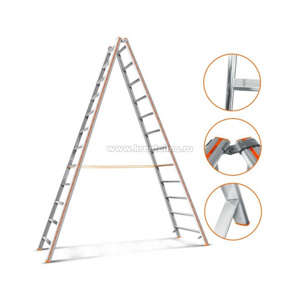 Серия Комфорт-Профи Эйфель исполнена из алюминия. Фурнитура из оцинкованной стали особой конструкции обеспечивает плавное раскрытие и закрытие механизма. Вместо стальных стопоров, производитель использует капроновые ремни безопасности. Именно благодаря им в сложенном состоянии стремянка занимает минимум пространства.