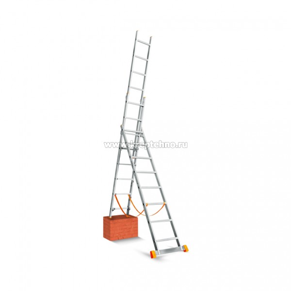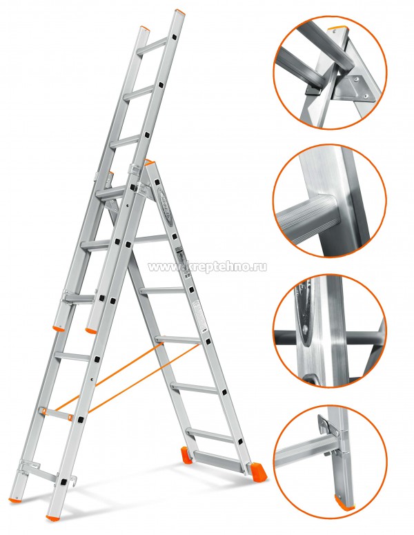 Лестницы алюминиевые 3-х секционные состоят из трех секций-лестниц. Две секции скреплены друг с другом при помощи специальных соединений и ремней, а третий (выдвижной) сегмент является съемным и может быть использован отдельно, как приставная лестница.