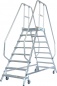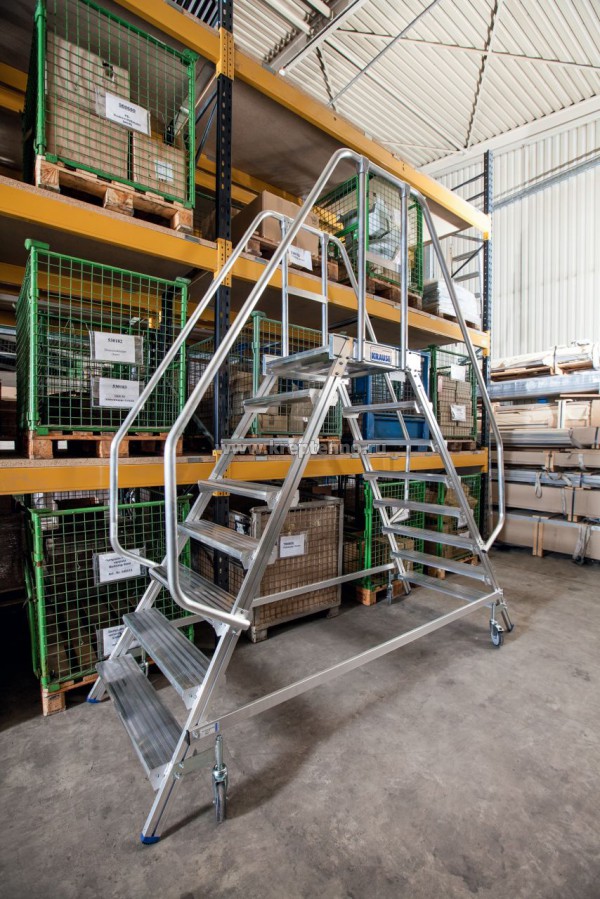 Небольшая ширина подходит для использования среди стеллажей Платформа 600 х 700 мм из рифленого алюминия Двухстороннее ограждение платформы высотой 1,0 м, с защитной планкой на уровне колен и плинтусом Надежное соединение поручней с ограждением платформы обеспечивают высокую безопасность 4 поворотных ролика (Ø 125 мм), 2 из них с тормозами, обеспечивают легкую эксплуатацию и безопасное использование Поставка осуществляется в предварительно собранных модулях Начиная с высоты платформы 1,00 м, с обеих сторон требуются поручни в соответствии с DIN EN 131-7. Соответственно, поручни должны заказываться как необходимые аксессуары. Продукт сертифицирован в строгом соответствии с ГОСТ Р 58752-2019 и DIN EN-131 Рабочая высота: 3,90м Ступеней 2х8 A ≈ м 3,90