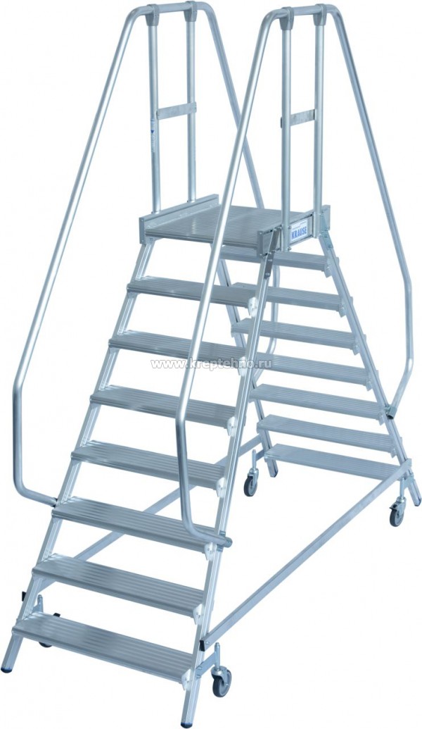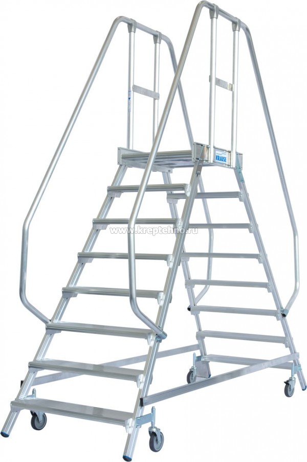 Лестница-платформа с 8-ю алюминевыми ступеньками двухсторонняя, KRAUSE Двухсторонние передвижные алюминиевые лестницы с платформой. Широкие ступени, трехстороннее ограждение и большая платформа для удобства и безопасности при работе.