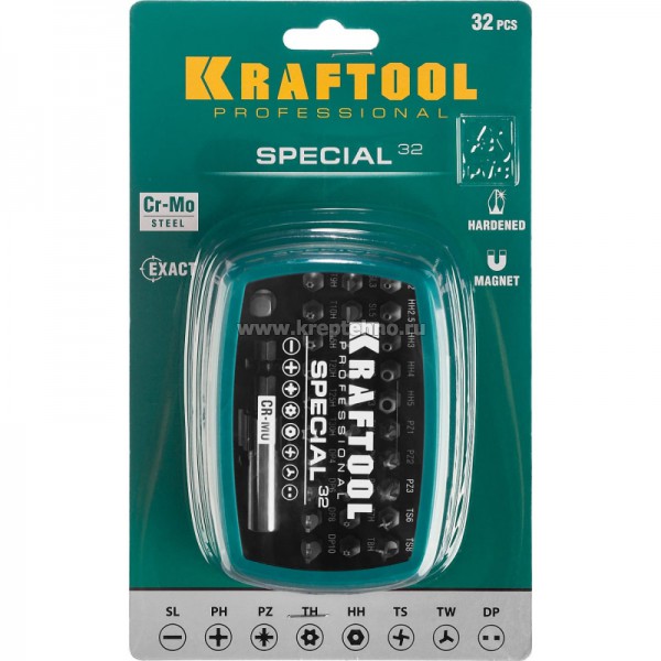 Набор бит 32 шт антивандальных (PH,PZ,SL,TH, HH,TW,TS,DP) с магн. держателем , KRAFTOOL 2610-Н32
