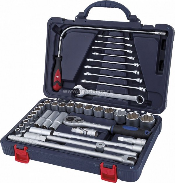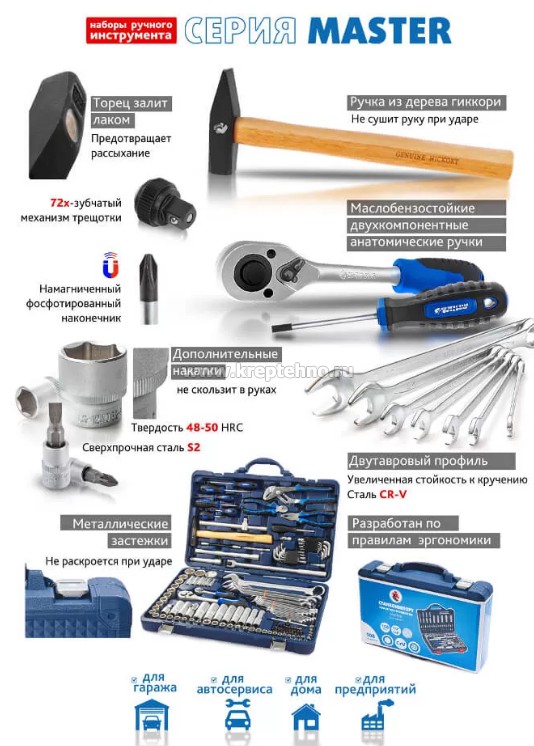 В наборе собраны инструменты общего назначения, необходимые для работы в гараже и мастерской.