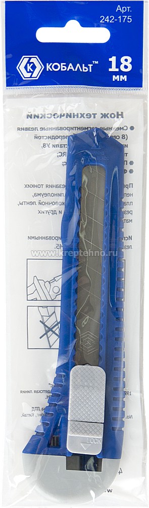 Нож КОБАЛЬТ 242-175 технический лезвие 18 мм., корпус из АБС пластика, сдвижной стопор фиксации лезвия.