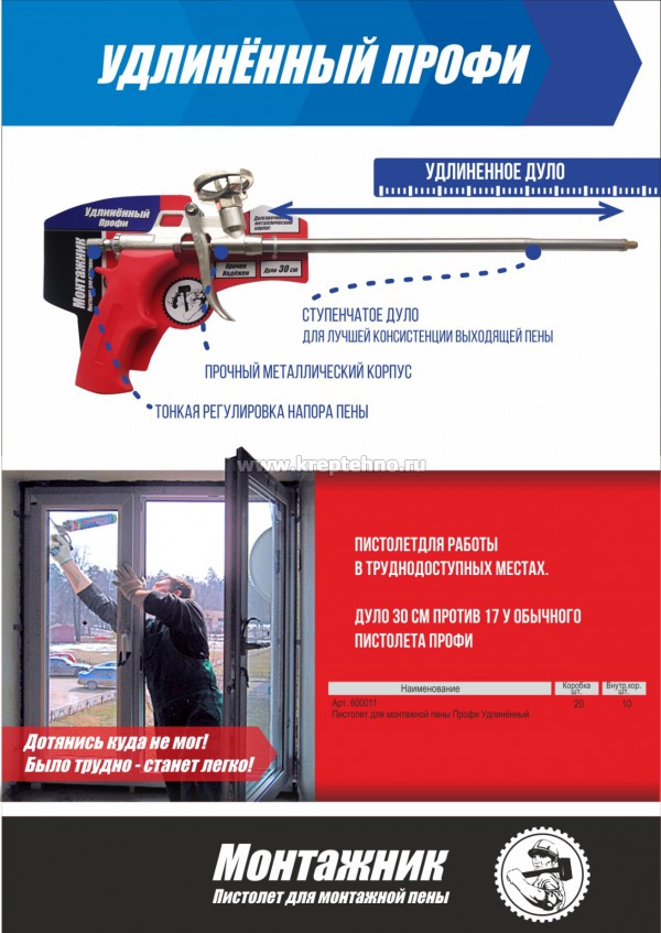 Пистолет для монтажной пены, «удлинённый» профи, не имеет аналогов.
