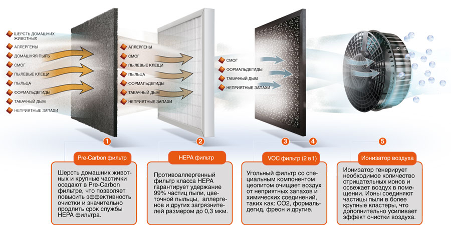 Это поколение воздухоочистителей обеспечивает тщательную, многоступенчатую фильтрацию воздуха, очищая его от шерсти домашних животных, аллергенов, домашней пыли, пылевых клещей, пыльцы, бактерий, смога, формальдегидов, табачного дыма и неприятных запахов.