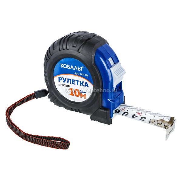 Рулетка 10м*25мм, противоскользящая, механический стопор, КОБАЛЬТ Рулетка 10м х 25мм обрезиненная КОБАЛЬТ 247-255 "Вектор" предназначена для измерения расстояний, снятия размеров, производства разметки при проведении строительных, интерьерных и монтажных работ.