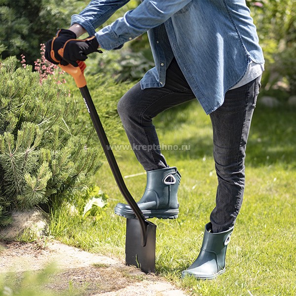 Закругленное лезвие лопаты Plantic Terra позволяет легко обрабатывать кромку газона, копать и разрыхлять землю