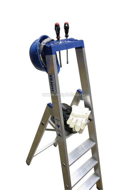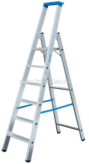 Стремянка 6 ступенчатая,профессиональная с полочкой, рабочая высота 3,40 м STABILO KRAUSE Односторонняя алюминиевая стремянка с высокопрочным развальцованным соединением ступенек со боковинами для долгосрочного профессионального применения Боковины из алюминиевого прессованного профиля с дополнительным усилением в особо нагруженных местах для повышения жесткости и защиты кромок Устойчивая профилированная площадка с высокой дугой безопасности для удобного расположения при длительных работах Заменяемая полка для инструментов с крюком для ведра Опорная часть с прочными поперечными распорками Защитные верхние заглушки на опорной части лестницы исключают защемление при раздвижении стремянки Стремянки с 6 ступеньками и более имеют дополнительно два ремня, устойчивых к атмосферным воздействиям Технические характеристики: