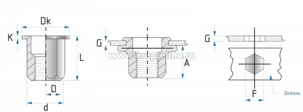 Заклепка резьбовая М8х1,25х18,0, сталь, стандартный шестигранный борт с насечками Гайка заклепочная шестигранная со стандартным бортом имеет более усиленную конструкцию за счет ребер жесткости. Гайка изготавливается в форме шестиугольника с цилиндрическим бортом (буртиком) и может использоваться с более высокой нагрузкой по сравнению с цилиндрической резьбовой заклёпкой. Монтажное отверстие для шестигранной заклёпки-гайки (HEX) изготавливают посредством вырубки или лазерной плазменной резки. После расклепывания получается шестигранный выступ и упорный буртик. Технические характеристики: | D | G,мм | F,мм +0,1/-0 | d,мм +0,07/-0,1 | Dк,мм | k,мм ± 0,15 | L, мм ± 0,30 | A Ref. | | М4 | 0,5-2,0 2,0-4,0 | 6,00 | 5,90 | 9,00 | 0,80 | 11,00 13,50 | 6,5 7,0 | | М5 | 0,5-3,0 2,5-5,0 | 7,00 | 6,90 | 10,00 | 1,00 | 13,00 16,50 | 7,5 8,0 | | М6 | 0,5-3,0 3,0-5,0 | 9,00 | 8,90 | 12,70 | 1,30 1,50 | 15,00 19,50 | 8,5 10,2 | | М8 | 0,5-3,0 3,5-6,0 | 11,00 | 10,90 | 16,00 | 1,50 | 18,00 21,00 | 10,2 | | М10 | 4,0-5,5 | 12,00 | 11,90 | 18,00 | 1,70 | 21,00 | 13,5 | | М10 | 1,0-4,0 4,0-6,0 | 13,00 | 12,90 | 18,00 | 1,70 | 21,00 23,00 | 12,5 14,0 | | М12 | 1,0-5,0 5,0-8,0 | 15,00 | 14,90 | 20,00 | 1,70 | 23,00 27,00 | 14,0 14,5 | | М12 | 2,0-5,0 | 16,00 | 15,90 | 23,00 | 2,00 | 27,00 | 16,5 | Механические параметры (Разрушающая нагрузка): Диаметр , D, мм | | | Вырыв болта, Кн | Скручивание резьбы, Нм | Срез ,Кн | | М3 | — | — | — | | М4 | 6.8 | 5 | 2.8 | | М5 | 11.5 | 9 | 3.9 | | М6 | 16.5 | 15 | 5.9 | | М8 | 25 | 26 | 7.0 | | М10 | 32 | 45 | 7.2 | | М12 | 34 | 115 | 7.5 | Купить Заклепку резьбовую стандартный шестигранный борт с насечками в Екатеринбурге и Свердловской области можно в сети магазинов КРЕПЕЖ-СИТИ. ВНИМАНИЕ! На сайте указано наличие товара на складе в Екатеринбурге. Наличие в магазинах просьба уточнять по телефонам. Доставка по Екатеринбургу от 10 тыс. руб. Доставка до ТК бесплатно. Скидки для постоянных покупателей. Интернет-заказы обрабатываются в рабочие дни с 10 до 18 часов.