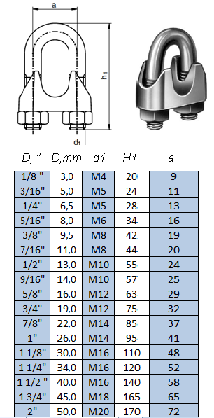 Зажимы для троса DIN741 представляют из себя U-образную скобу с резьбой на концах и ответной частью. Каждый зажим комплектуется двумя гайками.