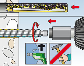 В процессе установки скошенная кромка шпильки RG M разбивает капсулу, перемешивает и активирует раствор.