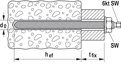 Резьбовая шпилька RG M устанавливается ударно-вращательным движением с помощью перфоратора и соответствующего монтажного инструмента.