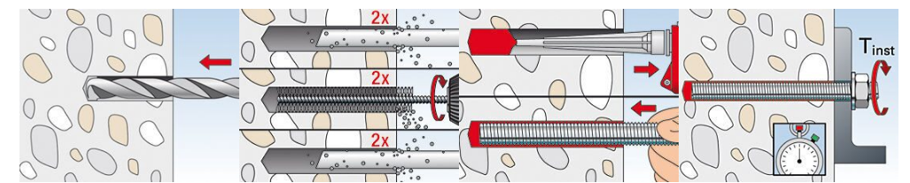 - Допущено для крепления в бетоне с трещинами и без трещин, кладке из полнотелого и пустотелого кирпича и ячеистом бетоне в сочетании с различными инъекционными составами fischer.