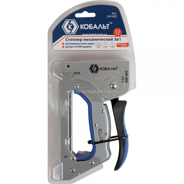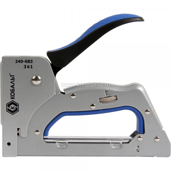240-683 Степлер мебельный 6-14мм, 3 в 1, тип 53, шпильки, гвозди, регулятор удара, КОБАЛЬТ шт 0.85 В наличии 1730 1730 В корзину