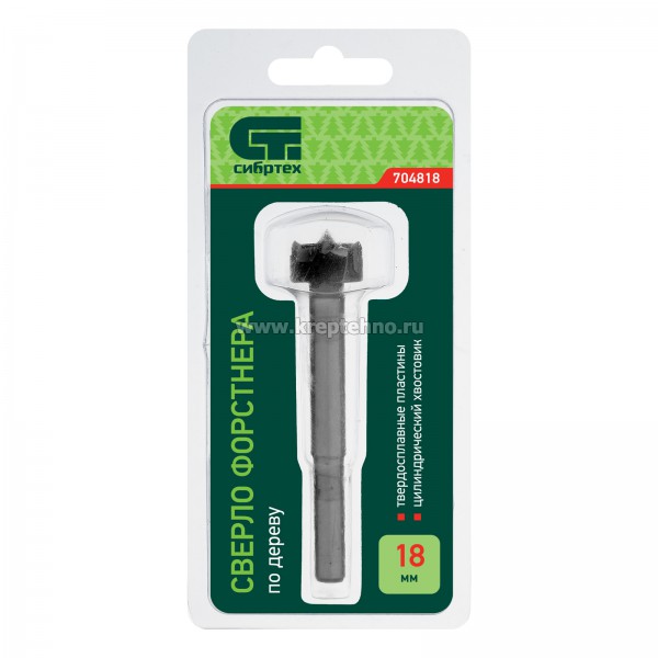 Сверло Форстнера по дереву Сибртех с цилиндрическим хвостовиком, используется для получения глухих отверстий диаметром 18 мм в древесине, ДСП, ДВП и других материалах.