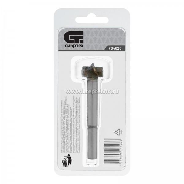 Сверло Форстнера по дереву Сибртех с цилиндрическим хвостовиком, используется для получения глухих отверстий диаметром 20 мм в древесине, ДСП, ДВП и других материалах.