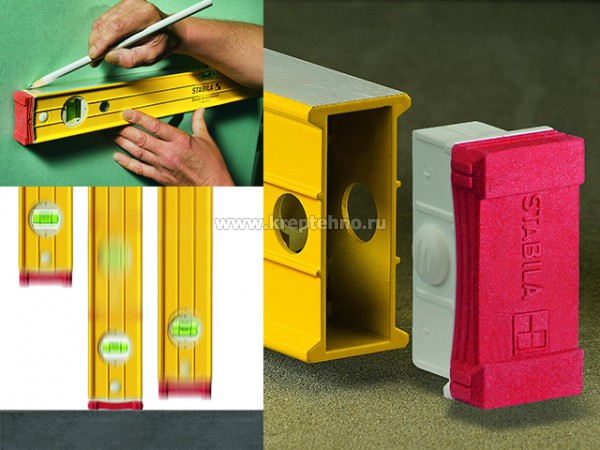 Уровень тип 96-2К, 80см (2 верт. 1 гориз., точность 0,5мм/м) для каменщика/плиточника, STABILA Запатентованная система защиты ватерпаса при постукиваниях и ударах (специальная пластиковая накладка): необходимую коррекцию при укладке кирпичей или плитки можно выполнить путем легких постукиваний мастерком или кельмой. Экономия времени, нет необходимости замены инструмента. Одна из двух вертикальных пузырьковых камер смещена ближе к центру, это облегчает взглядом, за один раз, одновременно видеть положение обеих камер, т.е. нижнюю и верхнюю. Прост в чистке и уходе, благодаря специальному покрытию корпуса ватерпаса, и отфрезерованному месту вокруг пузырьковых камер. Чрезмерно стабильный и прочный алюминиевый прямоугольный профиль ватерпаса, усиленный боковыми ребрами жесткости. Съемные, гасящие удары амортизирующие защитные колпачки, также имеющие с одной стороны боковые накладки (выступы) для предотвращения соскальзывания ватерпаса, при прикладывании его к скользкой или гладкой поверхности. Отфрезерованная измерительная поверхностью. Технические характеристики: